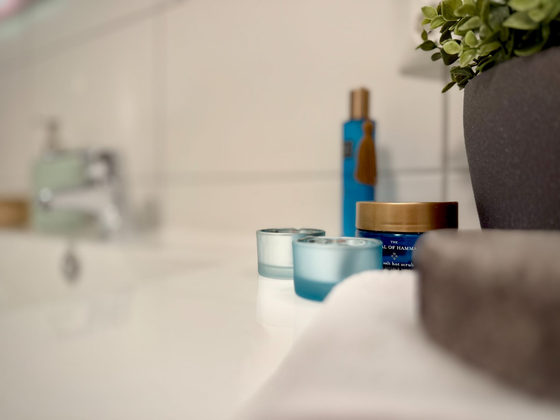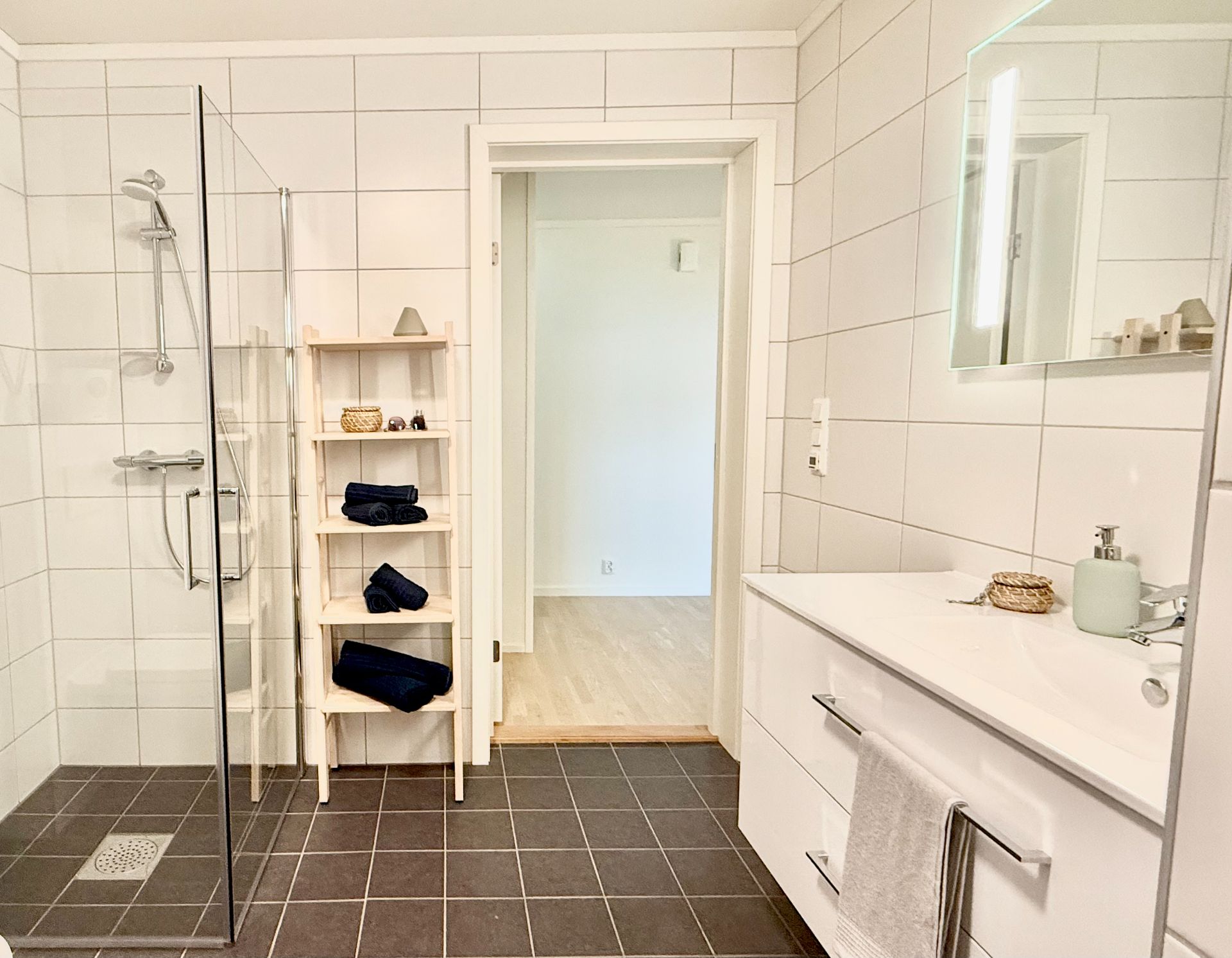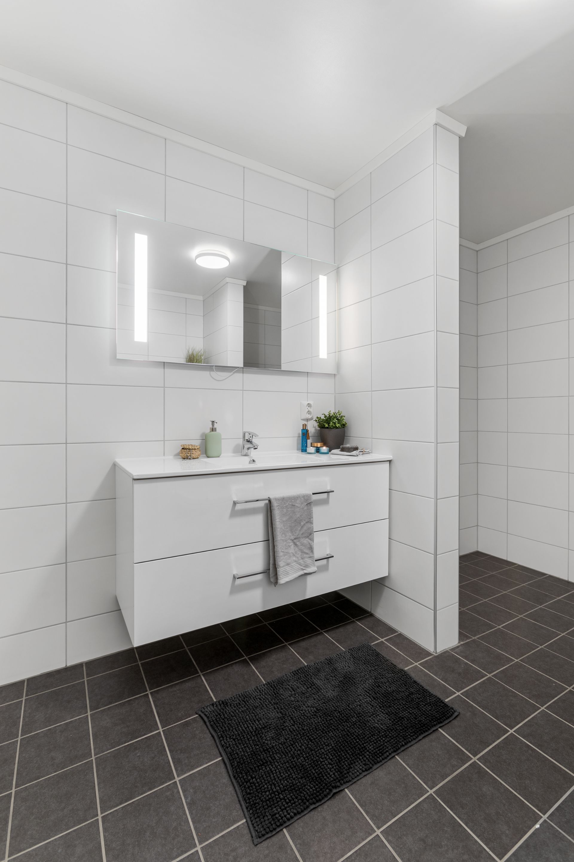 Det er to delikate og moderne bad i boligen – ett i hver etasje. Begge er flislagte, med varme i gulvene, og innredet i lyse, tidløse materialer. Badet i 1. etg har egen nisje med plass til vaskemaskin og tørketrommel.
