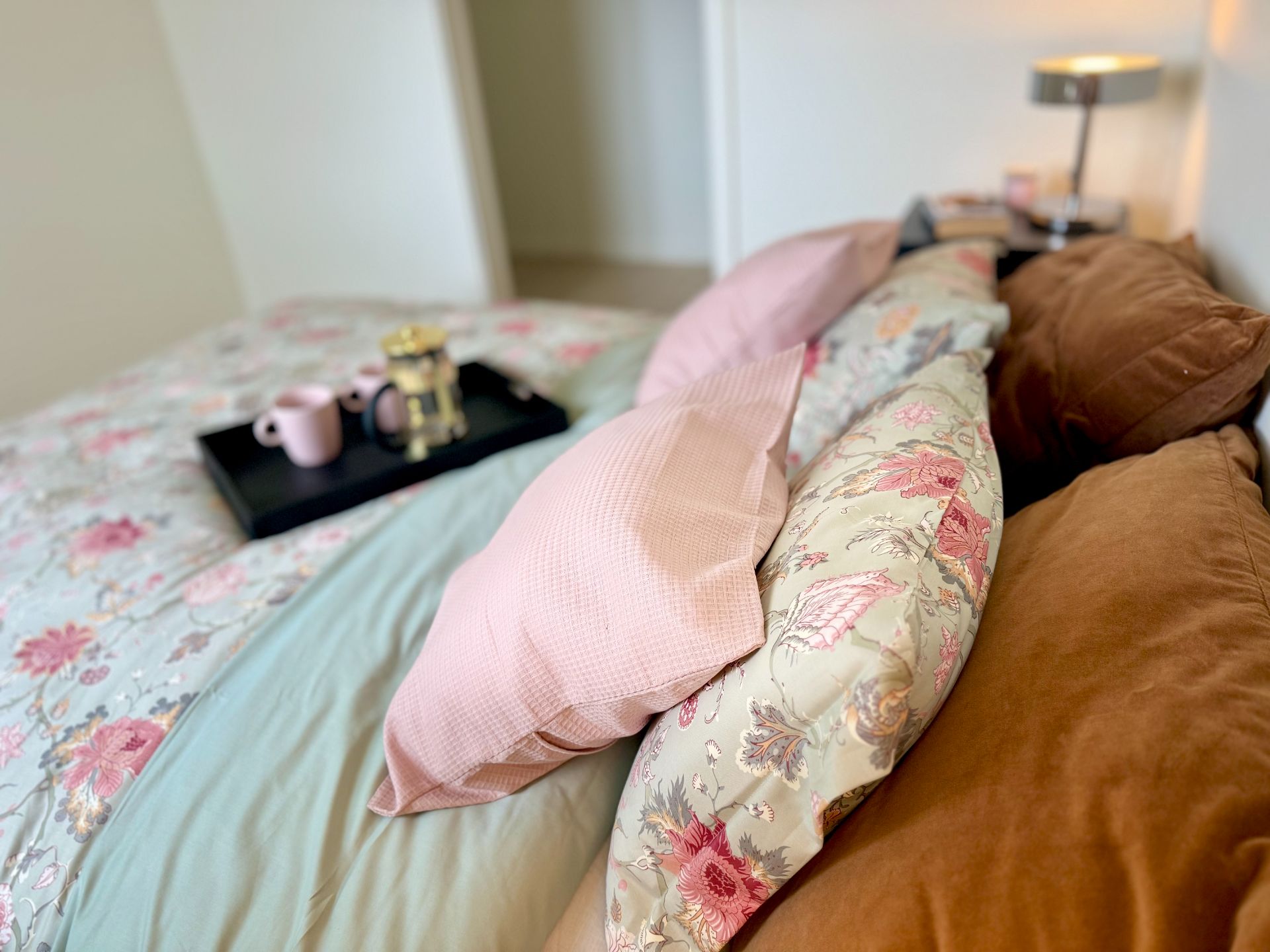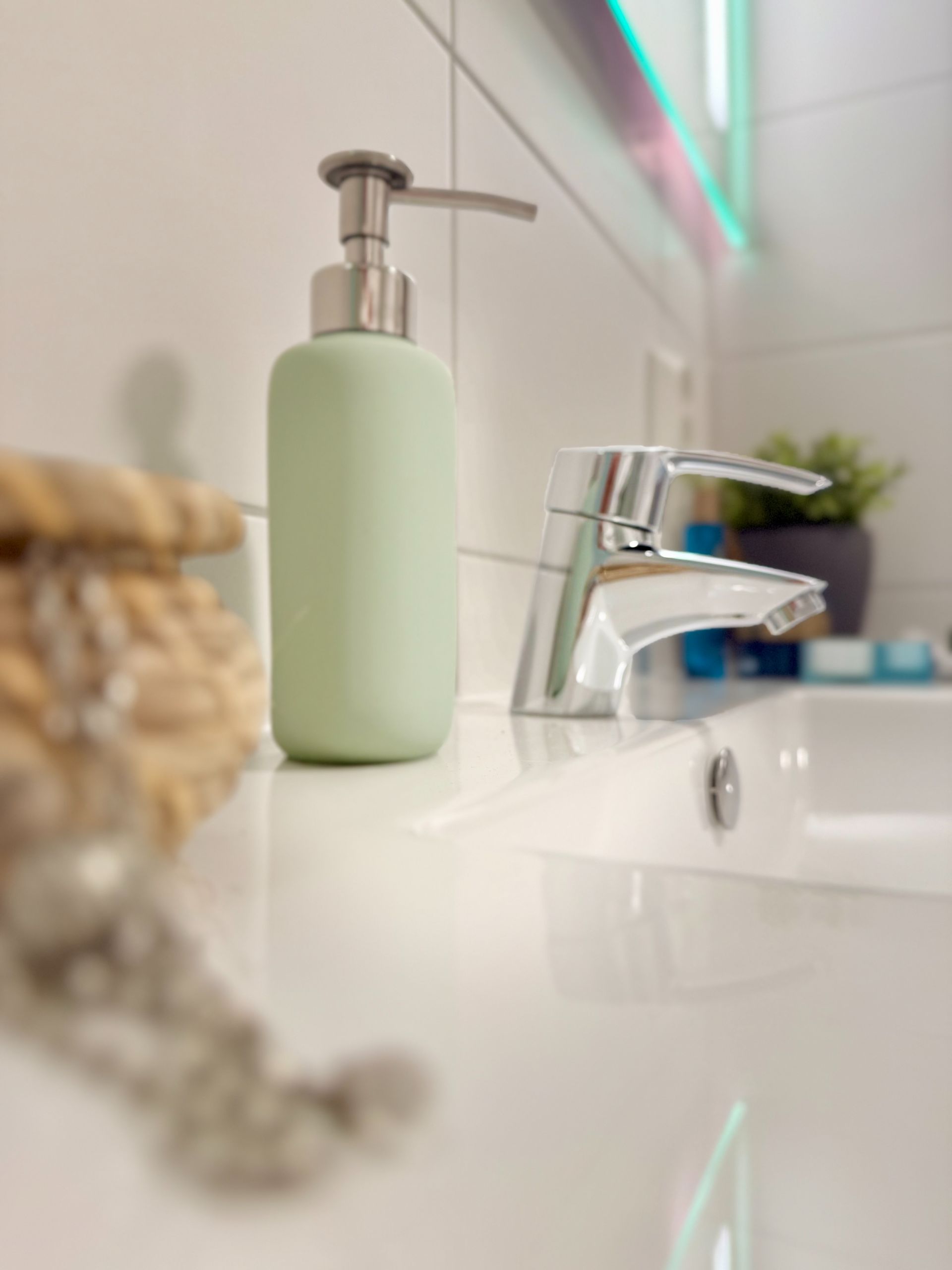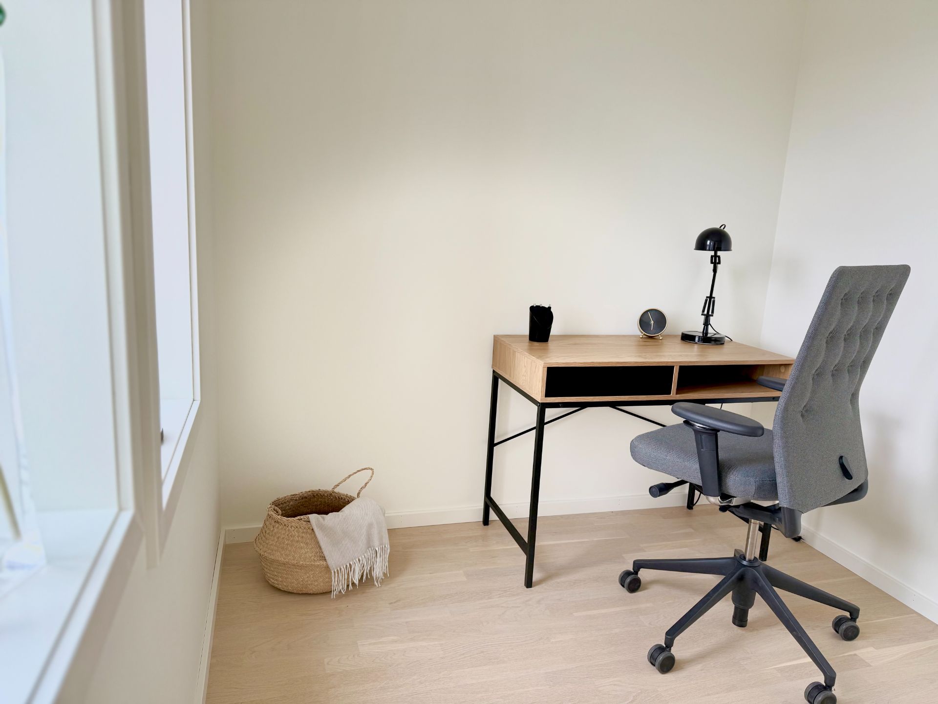 Det er to delikate og moderne bad i boligen – ett i hver etasje. Begge er flislagte, med varme i gulvene, og innredet i lyse, tidløse materialer. Badet i 1. etg har egen nisje med plass til vaskemaskin og tørketrommel.