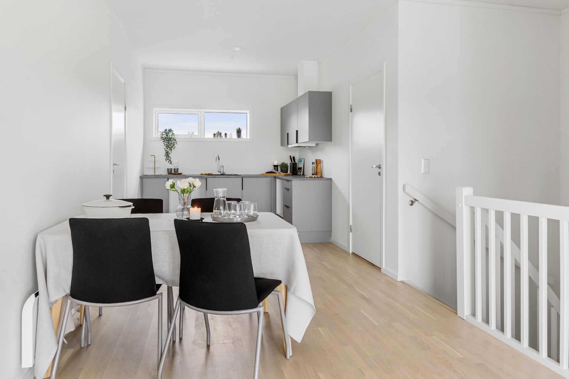 Den åpne stue- og kjøkkenløsningen i 2. etg er hjertet i hjemmet – her får du et romslig og moderne kjøkken. Stuen har store vindusflater som slipper inn rikelig med dagslys, og gir en lun og trivelig atmosfære. Fra stuen går du rett ut til en solrik balkong hvor du kan nyte morgenkaffen i fred og ro. Ut ifra det en soverommet i andre etasje finner du også en liten ekstra balkong i andre etasje.