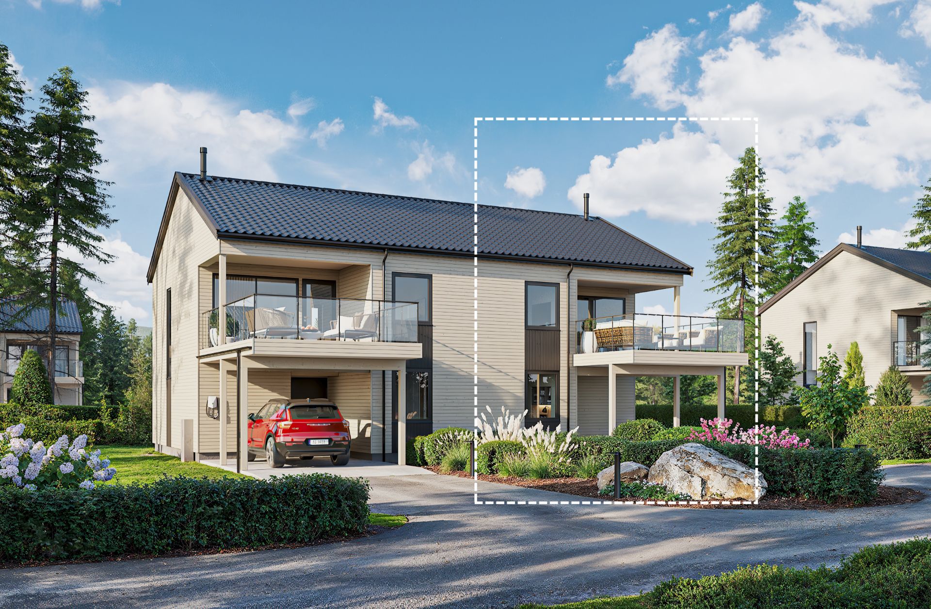 Fordelt på 107 kvadratmeter får du 4 soverom, stort bad, mulighet for ekstra WC i 2.etasje, godt med bodplass, samt et åpent og lyst allrom i 2.etasje med stue og kjøkken i åpen løsning. Fra stuen får du utgang til en stor, delvis overbygget balkong. Fire romslige soverom gir deg fleksibilitet, og har du f.eks. behov for kontorplass, er det ene soverommet i 2. etasje godt egnet til dette. Egen carport integrert i bygningskroppen, med direkte inngang til boligen, og egen hage.